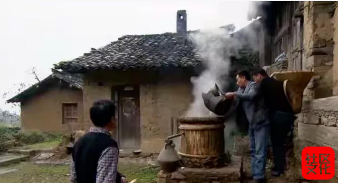 大约需要二十多天的时间酒糟子就发酵好了,父亲在泉水井旁支起了锅灶,底锅是又大有厚的牛头锅,上面架副酒樽子,酒撙子是木制的,无底无盖,形状下大上小。酒樽子在上锅之前是单块的,用时才箍起,不用时又拆卸成一捆木头片片。煮酒的火是要旺的,碗口粗细的干柴把底锅水烧得翻滚时,父亲就把酒糟子均匀的撒在樽子内的竹芭上,看到热气上来就再放一层糟子,父亲说糟子不能一次放的过多,放多了阻碍热气蒸腾,那样就塌气了,如果塌气了酒就没有能力出来,以前的工夫就白费了。当酒糟子上到出酒眼以上时,酒樽子里就不放糟子了。父亲用竹笋壳包紧酒流子从樽子内插到樽子外,一口洗干净的小锅放在樽子上口,叫安天锅。底锅与樽子交接处用稀泥密封,天锅与樽子上口则用湿布围一圈,天锅的水是要经常换的,热气遇冷形成水,天锅水太热可能就形不成酒了。母亲乘煮酒的日子,在一旁摆着大大小小的木盆,盛满天锅换下来的热水,搓洗全家积攒了一冬的衣被。