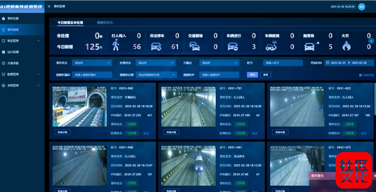 AI视频事件检测系统在融合了AI视觉算法、基于通义千问多模态大模型以及高性能硬件架构的基础上,针对国内复杂交通环境进行了深度优化与精准适配,能实现停车、行人、火灾、抛洒、逆行、拥堵、事故、驶离八类交通事件的智能识别。通过对视频、雷达等多源感知数据的分析,能够为高速公路路段及隧道场景提供全天候异常事件监测,实时推送告警信息至运营监控中心并同步事件核心数据,可提升交通异常事件的响应与处置效率。