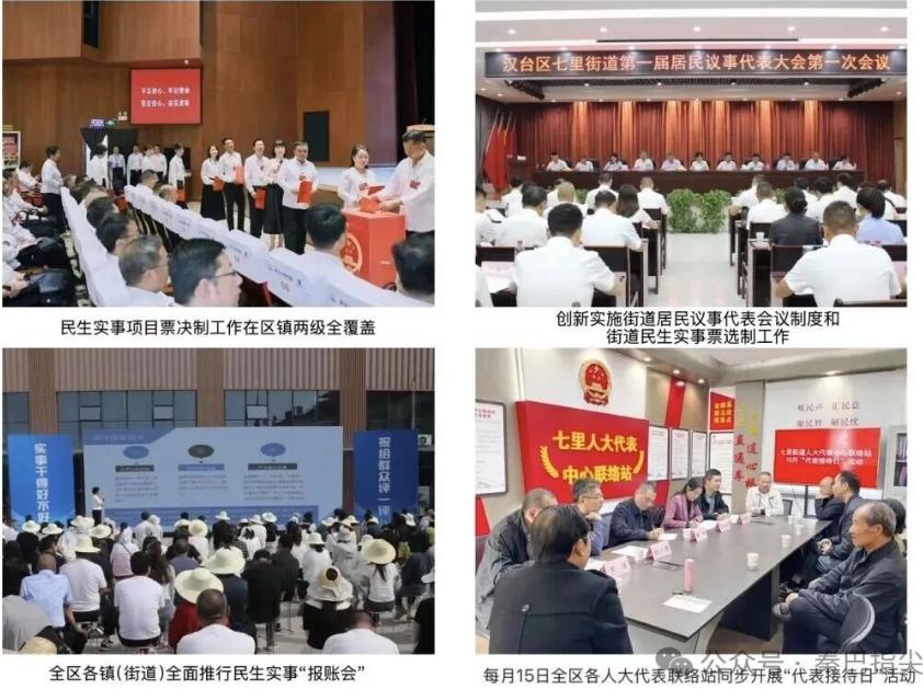 基层民主建设方面,区人大常委会不断拓宽民主渠道,让群众真正成为基层治理的参与者、受益者和监督者。2022年,全区68个镇(街道)、村(社区)人大代表联络站全面建成并常态化运行,每月15日的“代表接待日”成为群众表达诉求的重要平台,累计解决民生微实事730余件。2023年创新推行“1335”工作法,实现民生实事项目票决制区镇全覆盖,三年来推动30项区级、106项镇级民生实事项目落地实施,总投资超11亿元。2024年全面实施街道居民议事代表会议制度和民生实事票选制,票选出街道民生实事项目94项,总投资8107万元,让群众参与公共事务管理的渠道更加畅通。2025年推行民生实事“报账会”,85个民生项目现场向群众“交账”,4000余名群众参与,满意率达98.3%,形成民生实事监督闭环。三个基层立法联系点高效运行,让立法过程更接地气、更具民意基础。