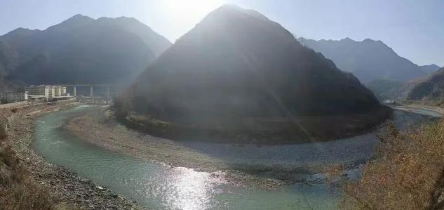 阳光透过山间,一道白光洒向墨绿色的乾佑河面。