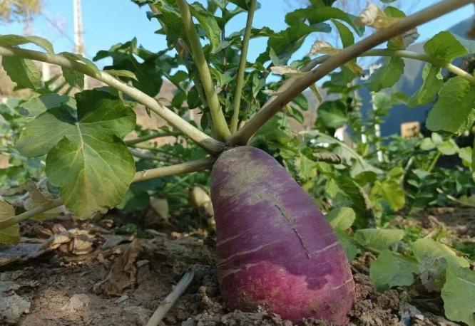 紫皮萝卜从泥土里探出头来,翠叶衬着紫红的,这是冬日里乡村最美好的丰收图景。