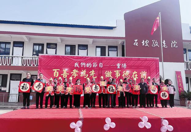 10月24日,石坡敬老院举行“百善孝为先·做事德在前”实践活动。图为敬老院为老人送“福”“寿”。