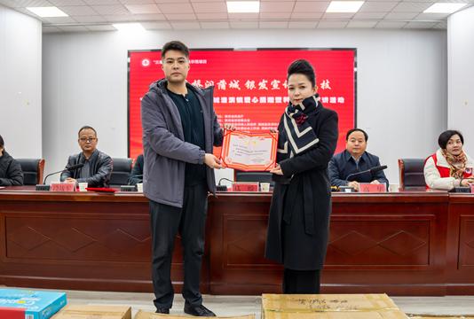 活动伊始,洛滨镇相关负责人致欢迎词,对各界助力本地乡村发展与教育事业的善举表示感谢。爱心捐赠环节,马盼副会长代表陕西省慈善联合会向洛滨镇九年制学校捐赠总价值3万元教学物资,精准补齐乡村教育办学物资短板,助力教育提质发展。现场还举行了聘书颁发与牌匾回赠仪式,洛滨镇为银发宣讲团颁发乡村振兴志愿宣讲聘书,学校则向省慈善联合会、西安曲江康桥学校回赠牌匾,政企校携手共促基层发展的深厚情谊在此凝聚。