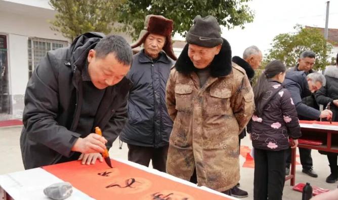 笔墨飘香传雅韵,春联送福暖千家。活动现场最热闹的当属春联书写专区,何正华、刘东安、汤保利、苟忠强、谢利斌等教师志愿者们凝神挥毫,饱蘸浓墨,笔走龙蛇间,一副副寓意吉祥的春联跃然纸上,“春回大地千山秀,福降人间万户欢”“勤劳门第春光好,和睦人家幸福多”,红底黑字的春联不仅承载着新春的美好祝福,更饱含着对乡亲们安居乐业、乡村蒸蒸日上的殷切期盼。村民们围在桌前,有的挑选心仪的春联内容,有的驻足欣赏书法艺术,脸上洋溢着幸福的笑容,纷纷排队等候属于自己的专属春联。考虑到村里行动不便的老年人、残疾人等特殊群体,志愿者们贴心开展上门送联服务,踩着乡间小路,把带着墨香的春联和满满的祝福送到家门口,用脚步丈量民情,用温情温暖民心,实现文化惠民全覆盖,让传统文化的馨香浸润每一个角落。书写间隙,志愿者们还耐心为村民讲解春联的民俗渊源、对仗技巧与书法审美,在一问一答、一笔一画间,让中华优秀传统文化春风化雨般融入乡亲们的生活,厚植乡土文化根脉,涵养文明向善乡风。
