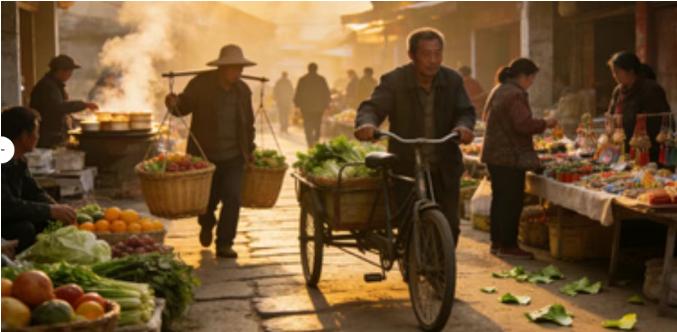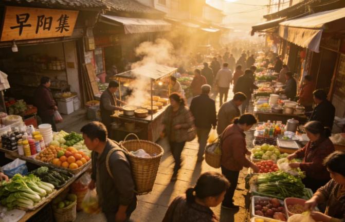 天刚蒙蒙亮,艾家河集市便醒了。摊主们早早占好位置,支起摊铺,琳琅满目的货物瞬间铺满街巷:带着泥土芬芳的瓜果蔬菜,活蹦乱跳的鸡鸭鱼虾,热气腾腾的包子馒头,色彩鲜亮的衣料鞋帽,还有针头线脑、农具农资,柴米油盐的琐碎,衣食住行的需求,在这里一应俱全。吆喝声此起彼伏,穿透晨雾,“新鲜青菜刚摘的,便宜卖喽”“正宗土鸡蛋,不掺一点假”,还有猪崽售卖、街头理发的朴实吆喝,声声都裹着生活的温度。乡亲们穿梭在摊位间,挑挑拣拣,讨价还价,话语里没有生疏,只有乡里乡亲的熟稔与亲切。张婶捏着萝卜掂量成色,李叔摸着布鞋感受针脚,孩子们拽着大人的衣角,眼睛直勾勾盯着小吃摊的糖画、炸麻花,软糯的哭闹声惹得大人们又气又笑,眉眼间却满是化不开的宠溺。这人间烟火,这家长里短,便是最动人的乡土日常。