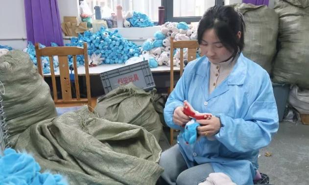 走进下梁镇嘉安移民社区润安毛绒玩具厂,缝纫机嗡鸣作响,30余名工人正埋头熟练地操作着机器,裁剪、缝纫、填充,指尖翻飞间,一个个造型可爱的毛绒玩具便成型了。