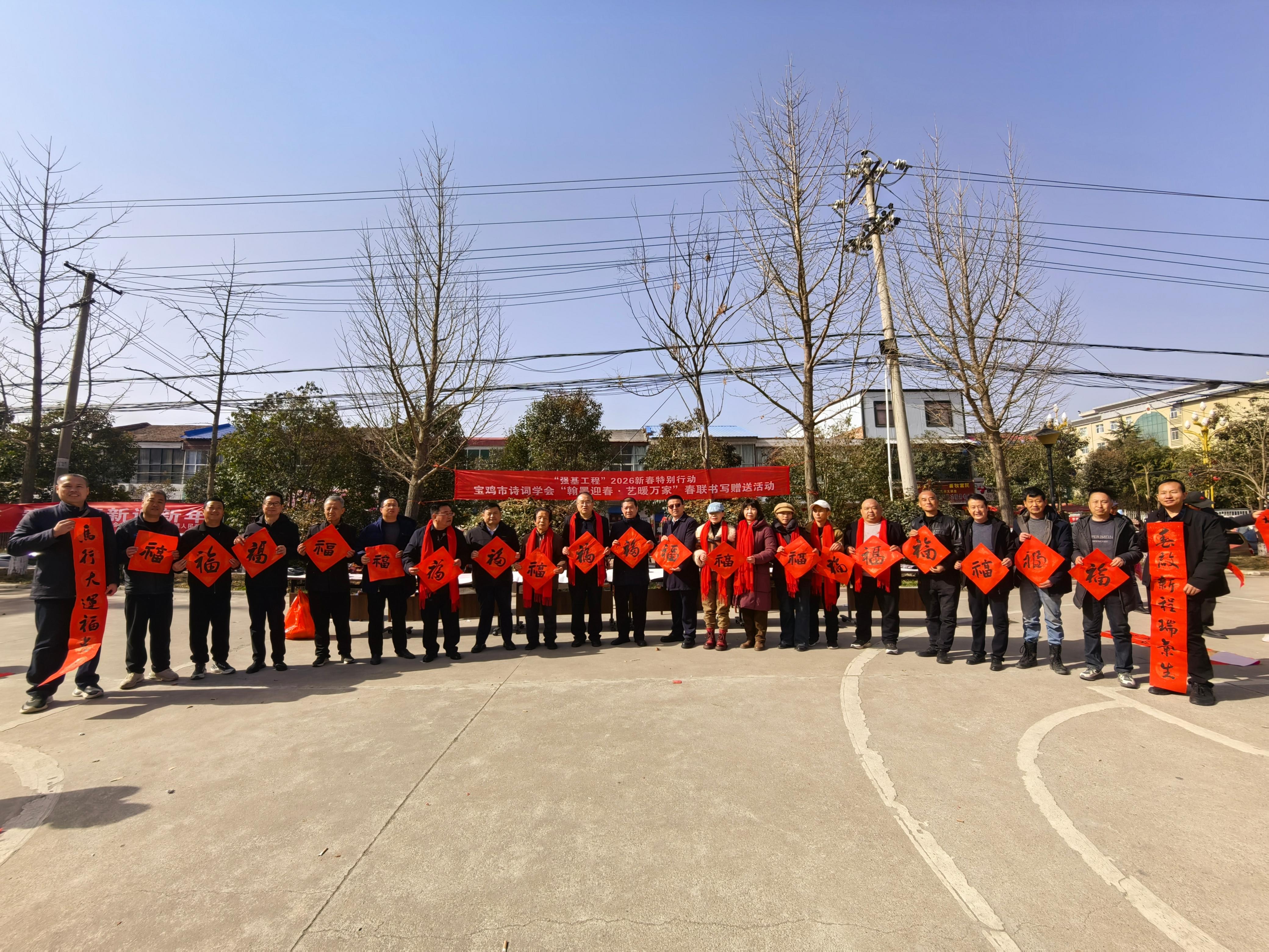 2月11日(农历腊月二十四),陕西省宝鸡市诗词学会会长董建新、副会长强健、宝鸡鼓鼎文化传媒有限公司总经理组织带领张金田、乔瑜等7名书法家会员,在宝鸡市陈仓区县功镇文化广场开展了强基工程2026特别行动“翰墨迎春•艺暖万家”春联书写赠送活动。县功镇党委书记蔺亮亮现场慰问各位书法家并合影留念。