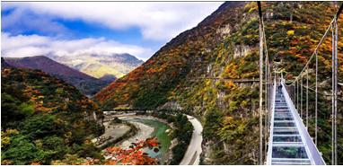 走完栈道便来到了距离地面几百米高的玻璃桥,宽敞的桥面在阳光的照射下放射出无数柱光芒,走在桥上就像走在云端,脚下是深不见底的幽谷与奔流不息的山涧。