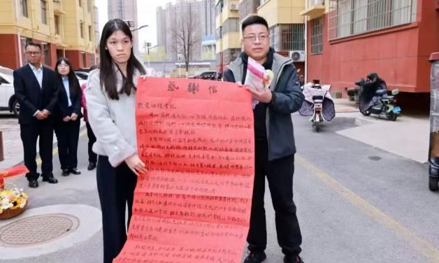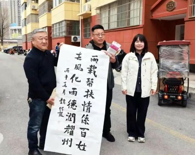 挂职干部在裕华园小区居住了两年多,天宝滩社区就在裕华园小区办公,社区党支部书记杨雅娟感念挂职干部参与社区传统节日、志愿服务、支持社区工作的点点滴滴,千言万语无从表达,只能以一面鲜红的锦旗来略表心意:倾心帮扶传党恩 心系基层办实事。社区9名工作人员和周围的群众带着家人和孩子都赶来了,要送段书记一程,和这个热心的邻居依依不舍。