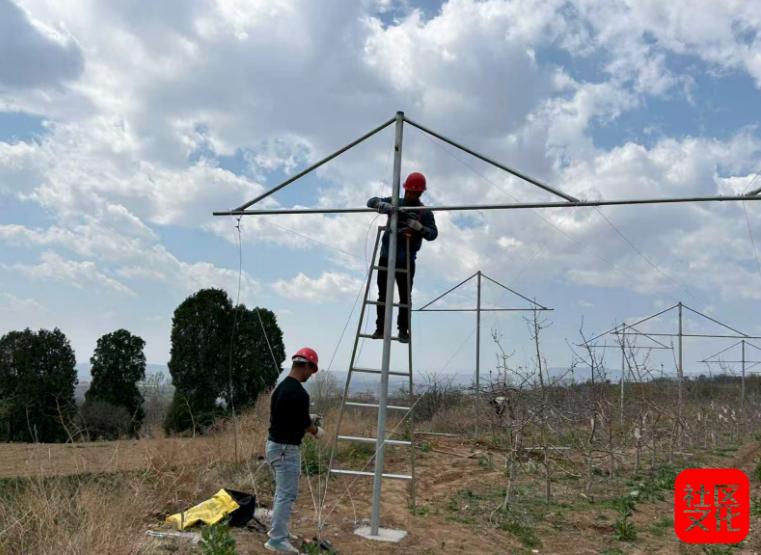 4月3日,在印台街道崖尧村的集体经济果园内,防雹网支架搭建施工正有序进行。立杆、架线、校准、加固……施工现场,一排排新竖起的镀锌钢架拔地而起,整齐划一。施工技术员武正弟介绍,该村60亩的防雹网工程已完成立杆,正在进行架线作业,预计4月中旬可完成覆网。