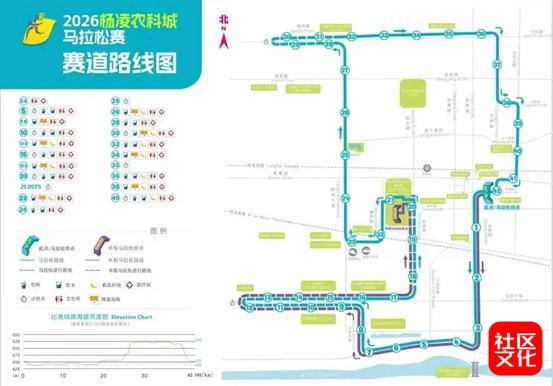 神果路农展广场(C馆广场起跑点)-神果路-新桥路-河堤路-水运西路-自贸大街西段(折返)-自贸大街-西农南路-西北农林科技大学南校区东门-西北农林科技大学南校区西门-博学路-兴平路-杨凌大道-北环路(向西)-北环路(折返点)-创新路-兴杨路-东环北路-渭惠路-东新路-神果路-农展广场(终点)全程42.195公里。