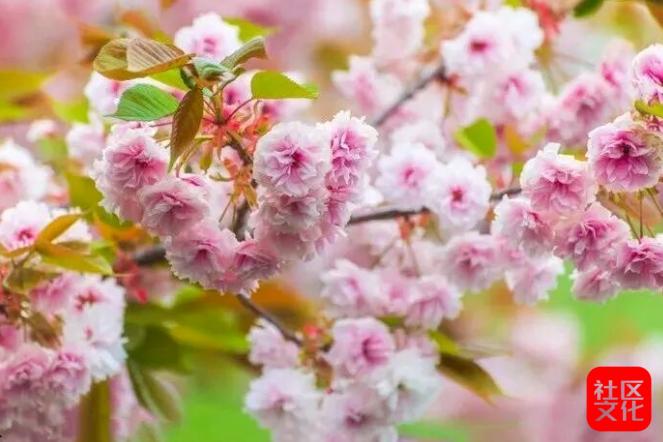 若说牡丹是雍容的主角,那樱花便是浪漫的点缀,为这片花海添上几分轻盈与梦幻。粉白相间的晚樱缀满枝头,密密匝匝的花簇如云似霞,连绵成一片温柔的花海。蓝天为幕,繁花为景,阳光透过花枝洒下斑驳光影,清风掠过,花瓣随风翩跹飘落,似漫天花雨,轻轻落在肩头、脚下,铺就一条浪漫的花径。漫步樱花树下,听风拂花枝的轻响,看落英缤纷的唯美,尘世的喧嚣与浮躁,都在这漫天飞花中渐渐消散,只剩满心的惬意与安然,随手定格一张照片,都是无需滤镜的春日童话,藏着最治愈的人间美好。